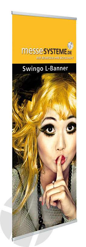 Elegantes und hochwertiges L-Bannersystem mit stabilem Gussfuß mit kurzer Aufbauzeit mit einer Grafikhöhe von 215cm.