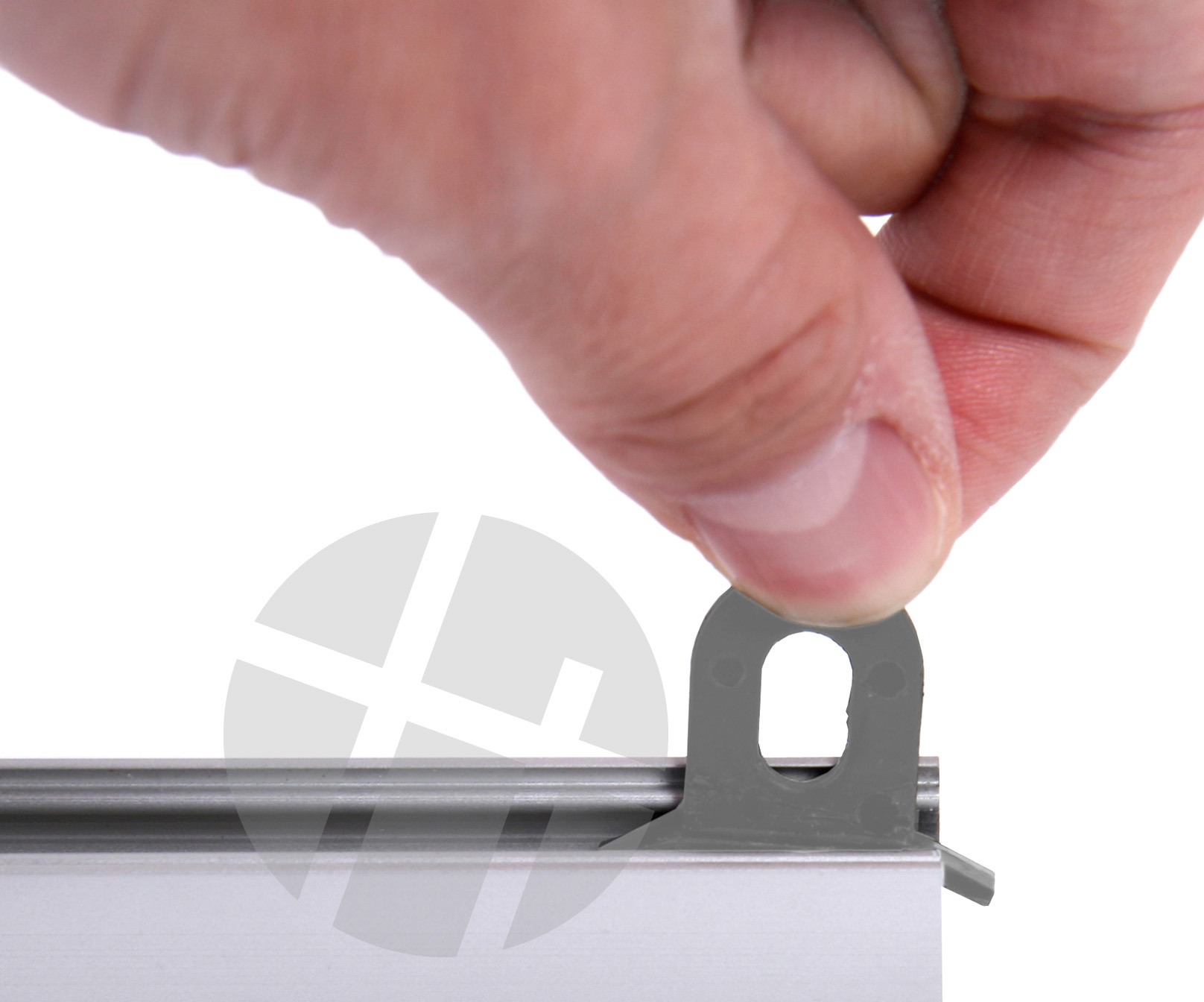 Sehr stabiles Klemmleistenset aus Aluminium. Ein Set besteht aus 2 Klemmleisten, 4 schwarzen Endkappen und 2 Aufhängeösen aus Kunststoff, die in der Position verschiebbar sind. Ideal für den Einsatz von PVC-Planen oder anderen schweren Bannern geeignet.